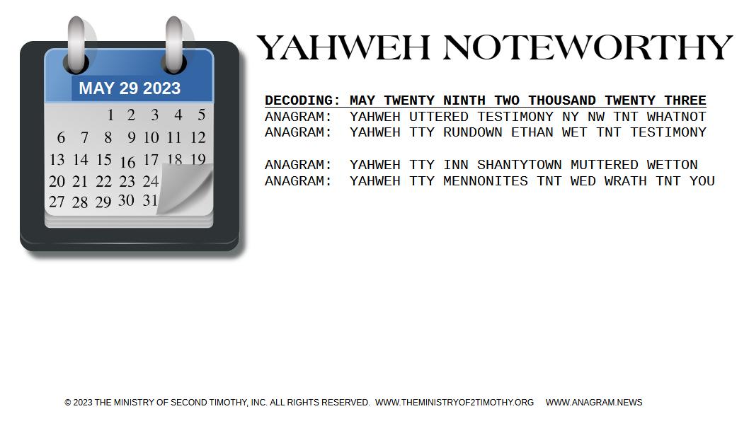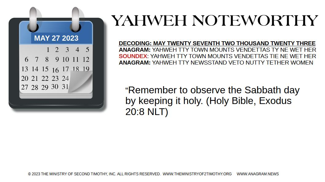 ANAGRAM: YAHWEH COUNTDOWN NOW DAYS Y TEETER TEST T MTN